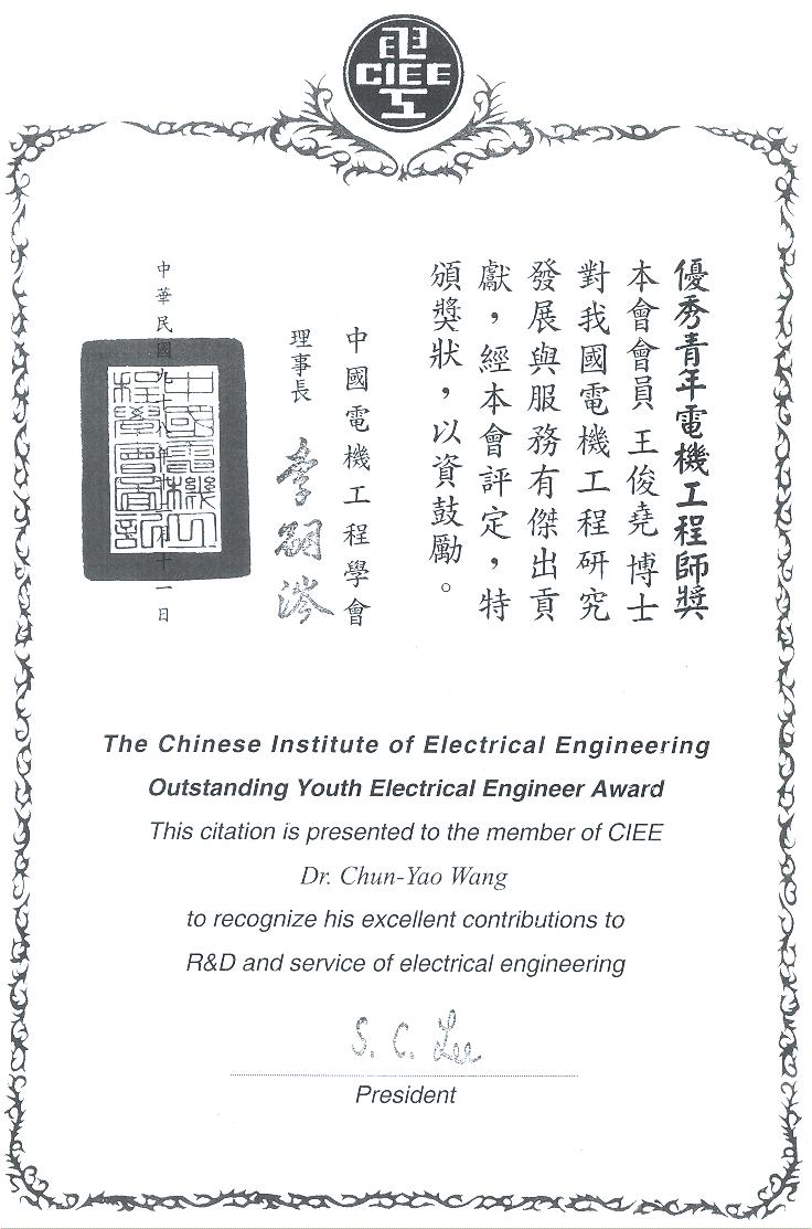 中國電機工程學會 傑出電機工程教授獎 (王俊堯) |